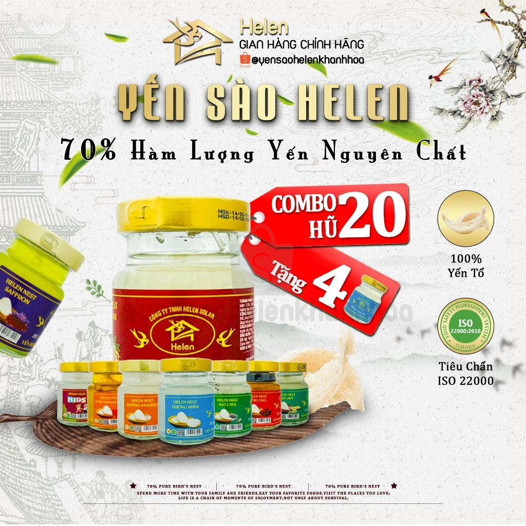 Nếu bạn đang tìm kiếm một sản phẩm yến sào chưng sẵn chất lượng và uy tín, có thể bạn nên xem xét Combo 20 hũ Yến Sào Helen Khánh Hòa Yến Sào Chưng Sẵn. Sản phẩm này được chưng sẵn với 70% yến nguyên chất và được đóng gói trong hũ 75ml.