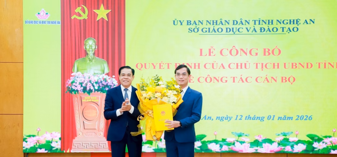 Tiến sĩ Nguyễn Văn Khoa đã chính thức được bổ nhiệm giữ chức Giám đốc Sở Giáo dục và Đào tạo tỉnh Nghệ An với nhiệm kỳ 5 năm. Buổi công bố diễn ra vào chiều ngày 12/1/2026 tại trụ sở Sở GD-ĐT, do Chủ tịch UBND tỉnh Nghệ An ký quyết định.